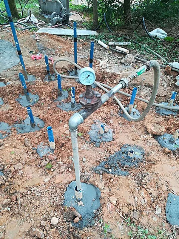 1、注漿孔布置:孔距1.5m,排距1.5m,正方形布置,孔徑約90-110mm,孔深至填土層底面。